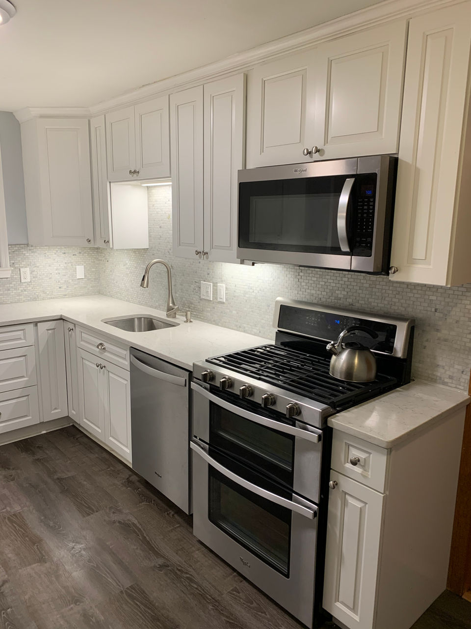 After a water supply line let go underneath the kitchen sink, causing an abundance of water damage throughout the entire kitchen floor, The Property Source was called in to restore the kitchen to it’s previous virtue. Remove rotted flooring, replace structural sub flooring, reinstall cabinets, new flooring, fresh paint, reinstall appliances.